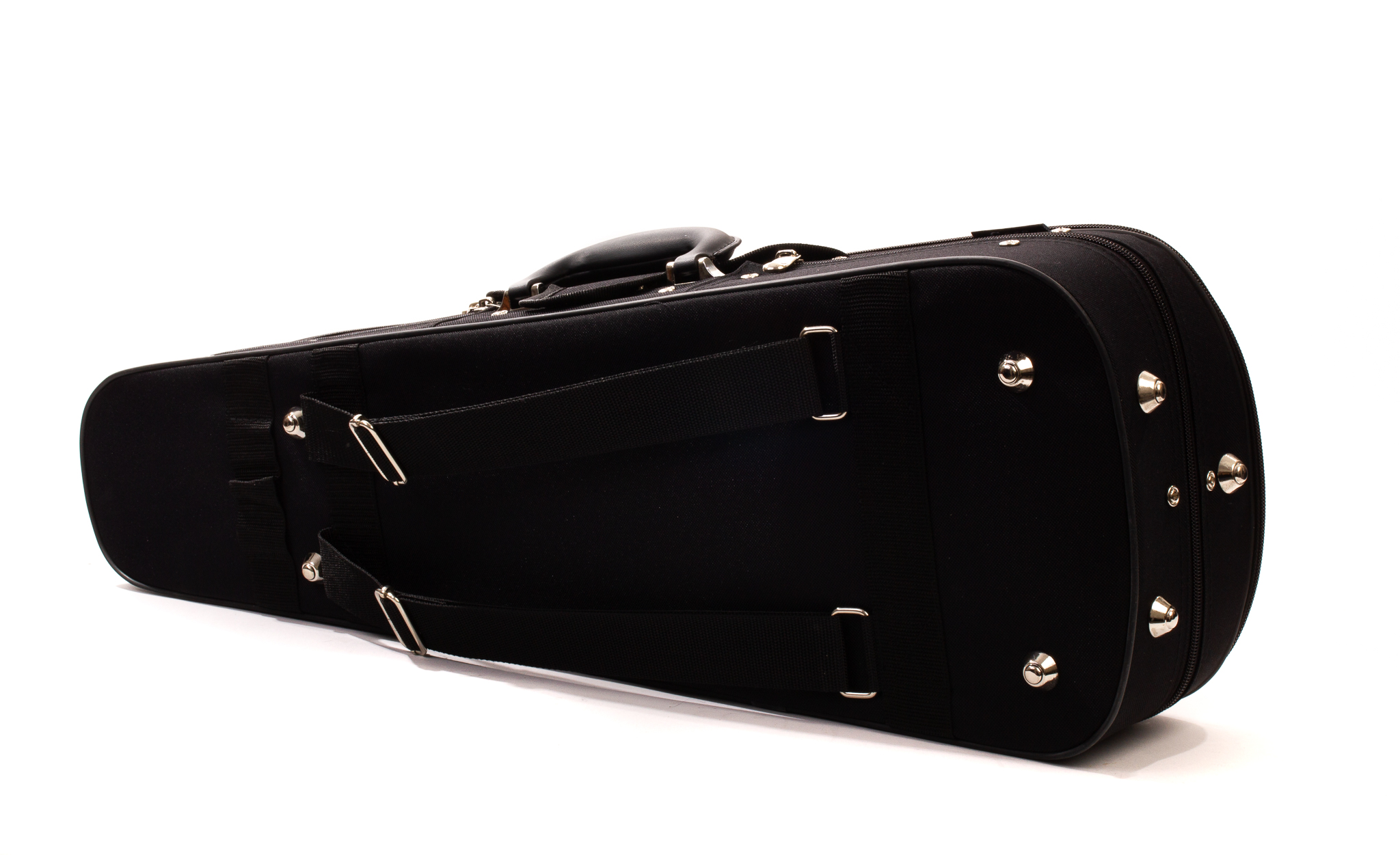 Well-appointed, with hygrometer, string tube, two bow holders, accessory pocket, and velcro shoulder rest holder. Canvas exterior with full length zippered music pocket, latch flap and backpack straps. Black exterior with blue velvet interior.